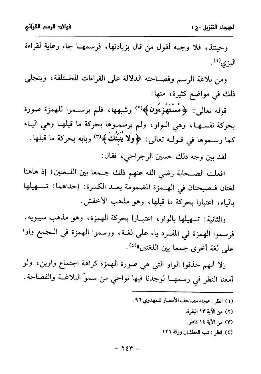 قوله تعالى: مستهزءون (¬2) وشبهها، فلم يرسموا للهمزة صورة بحركة نفسها، وهي الواو، ولم يرسموها بحركة ما قبلها وهي الياء كما رسموها في قوله تعالى: ولا ينبئك (¬3) وبابه بحركة ما قبلها.