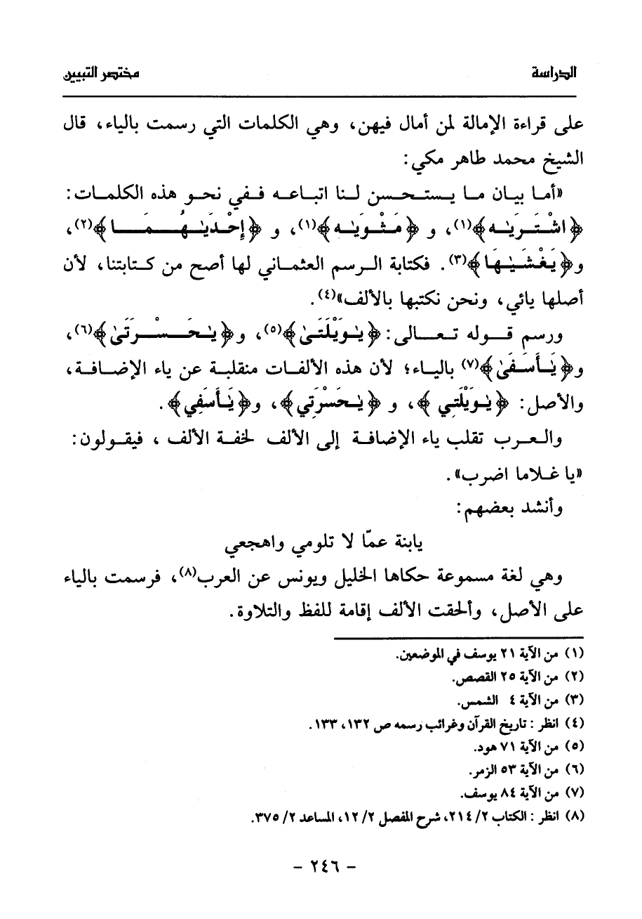 يا ابنة عمّا لا تلومي واهجعي وهي لغة مسموعة حكاها الخليل ويونس عن العرب (¬8)، فرسمت بالياء على الأصل، وألحقت الألف إقامة للفظ والتلاوة.