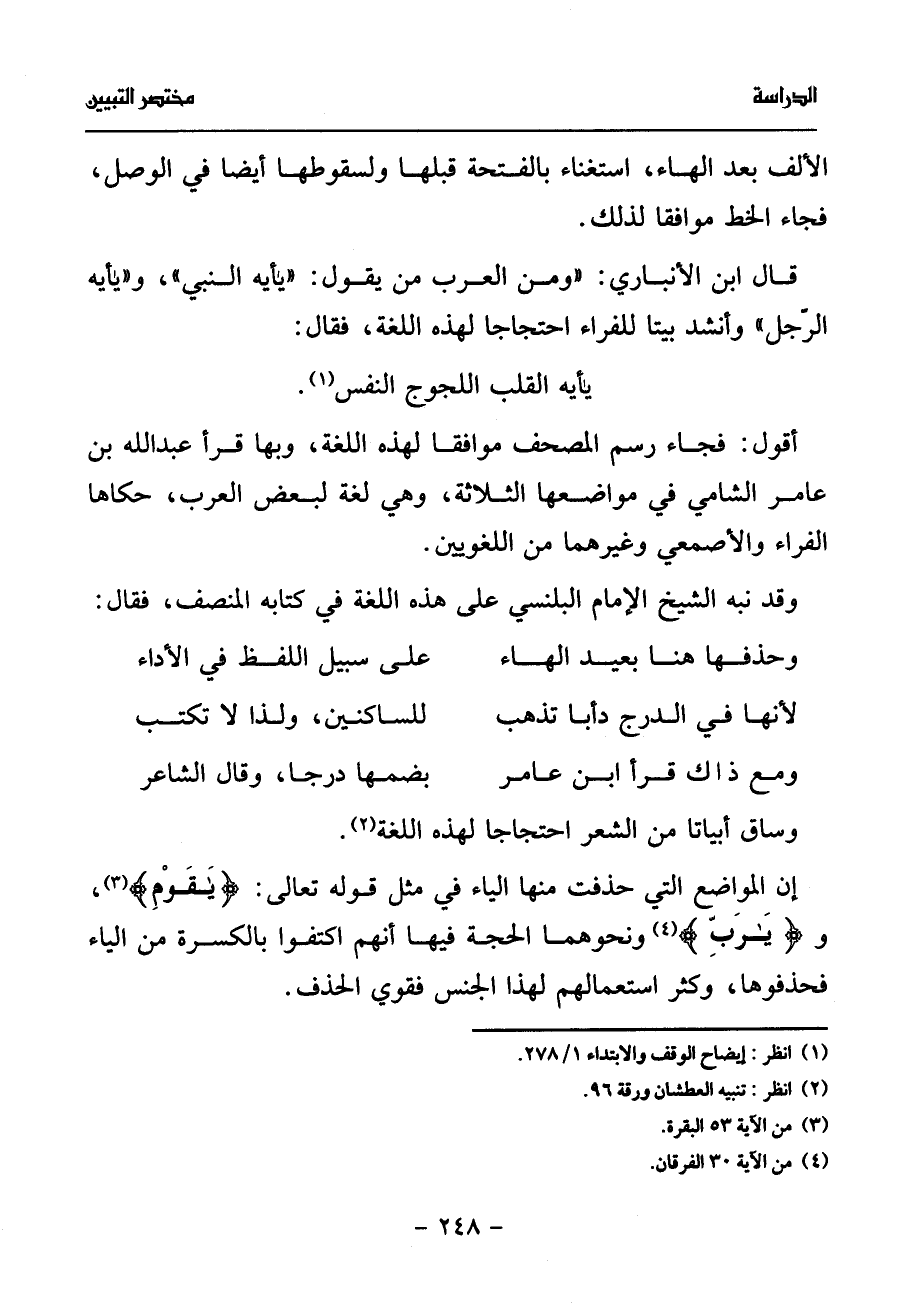 وحذفها هنا بعيد الهاء* على سبيل اللفظ في الأداء لأنها في الدرج دأبا تذهب* للساكنين، ولذا لا تكتب ومع ذاك قرأ ابن عامر* بضمها درجا، وقال الشاعر وساق أبياتا من الشعر احتجاجا لهذه اللغة (¬2).