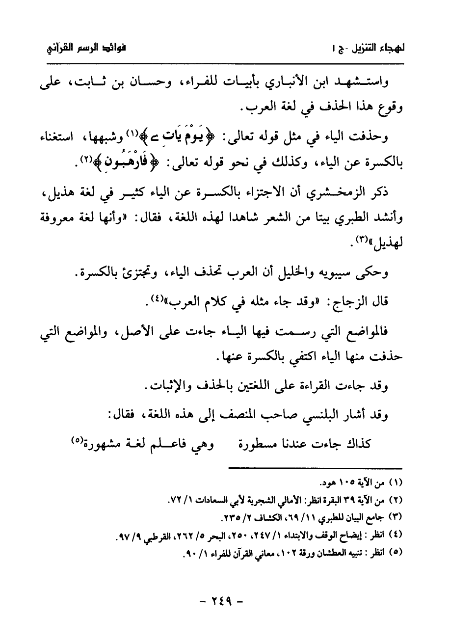 ذكر الزمخشري أن الاجتزاء بالكسرة عن الياء كثير في لغة هذيل، وأنشد الطبري بيتا من الشعر شاهدا لهذه اللغة، فقال: «وأنها لغة معروفة لهذيل» (¬3).