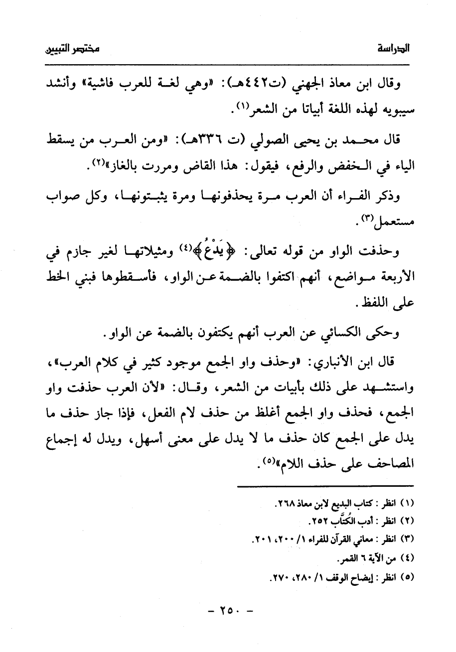 قال ابن الأنباري: «وحذف واو الجمع موجود كثير في كلام العرب»، واستشهد على ذلك بأبيات من الشعر، وقال: «لأن العرب حذفت واو الجمع، فحذف واو الجمع أغلظ من حذف لام الفعل، فإذا جاز حذف ما يدل على الجمع كان حذف ما لا يدل على معنى أسهل، ويدل له إجماع المصاحف على حذف اللام» (¬5).