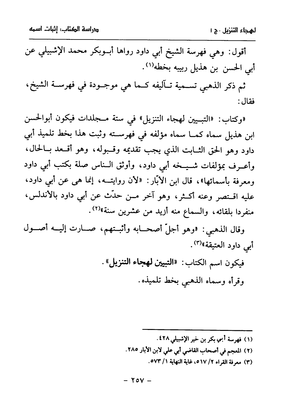 «وكتاب: «التبيين لهجاء التنزيل» في ستة مجلدات فيكون أبو الحسن ابن هذيل سماه كما سماه مؤلفه في فهرسته وثبت هذا بخط تلميذ أبي داود وهو الحق الثابت الذي