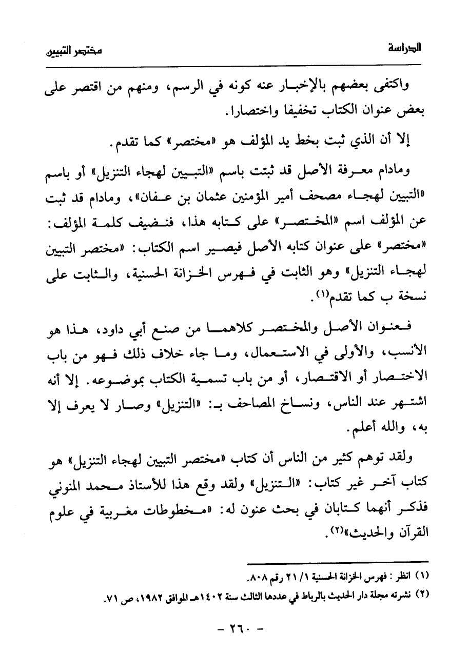ولقد توهم كثير من الناس أن كتاب «مختصر التبيين لهجاء التنزيل» هو كتاب آخر غير كتاب: «التنزيل» ولقد وقع هذا للأستاذ محمد المنوني فذكر أنهما كتابان في بحث عنون له: «مخطوطات مغربية في علوم القرآن والحديث» (¬2).