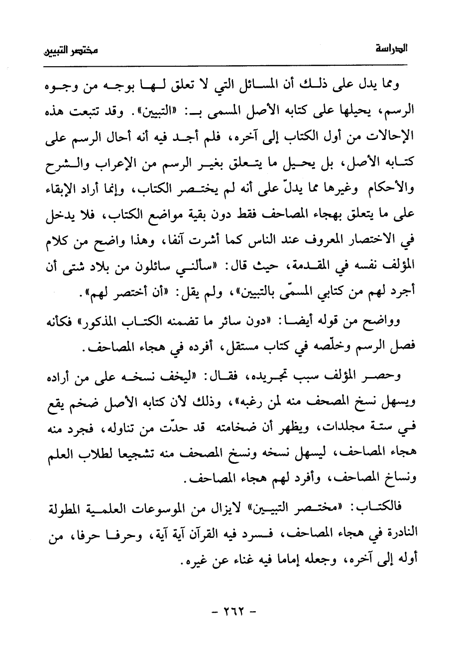 ومما يدل على ذلك أن المسائل التي لا تعلق لها بوجه من وجوه الرسم، يحيلها على كتابه الأصل المسمى ب: «التبيين». وقد تتبعت هذه الإحالات من أول الكتاب إلى آخره، فلم أجد فيه أنه أحال الرسم على كتابه الأصل، بل يحيل ما يتعلق بغير الرسم من الإعراب والشرح والأحكام وغيرها مما يدلّ على أنه لم يختصر الكتاب، وإنما أراد الإبقاء على ما يتعلق بهجاء المصاحف فقط دون بقية مواضع الكتاب، فلا يدخل في الاختصار المعروف عند الناس كما أشرت آنفا، وهذا واضح من كلام المؤلف نفسه في المقدمة، حيث قال: «سألني سائلون من بلاد شتى أن أجرد لهم من كتابي المسمّى بالتبيين»، ولم يقل: «أن أختصر لهم».