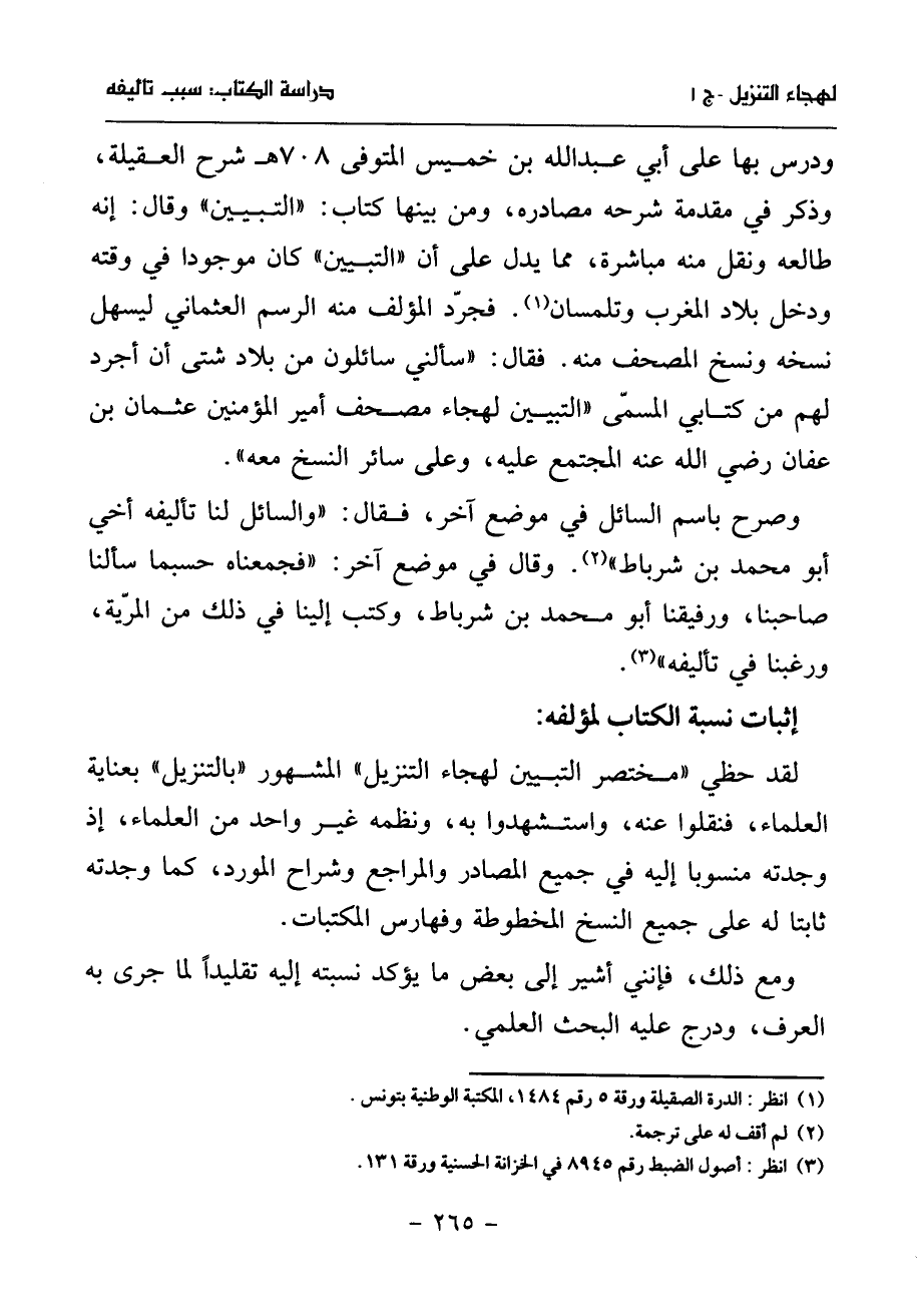 ودرس بها على أبي عبد الله بن خميس المتوفى 708 هـ شرح العقيلة، وذكر في مقدمة شرحه مصادره، ومن بينها كتاب: «التبيين» وقال: إنه طالعه ونقل منه مباشرة، مما يدل على أن «التبيين» كان موجودا في وقته ودخل بلاد المغرب وتلمسان (¬1). فجرّد المؤلف منه الرسم العثماني ليسهل نسخه ونسخ المصحف منه. فقال: «سألني سائلون من بلاد شتى أن أجرد لهم من كتابي المسمّى «التبيين لهجاء مصحف أمير المؤمنين عثمان بن عفان رضي الله عنه المجتمع عليه، وعلى سائر النسخ معه».