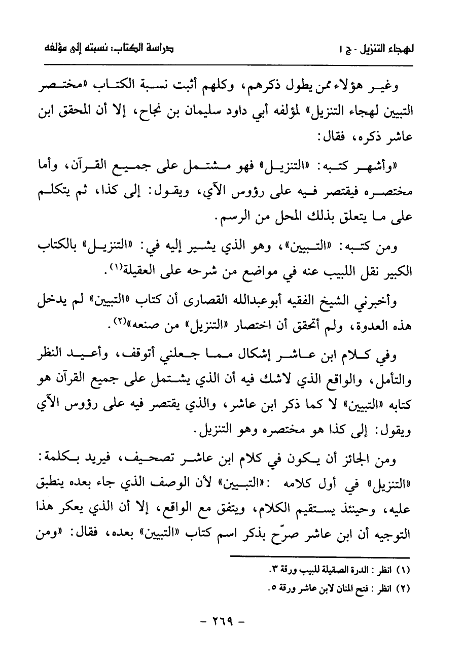 وفي كلام ابن عاشر إشكال مما جعلني أتوقف، وأعيد النظر والتأمل، والواقع الذي لا شك فيه أن الذي يشتمل على جميع القرآن هو كتابه «التبيين» لا كما ذكر ابن عاشر، والذي يقتصر فيه على رءوس الآي ويقول: إلى كذا هو مختصره وهو التنزيل.