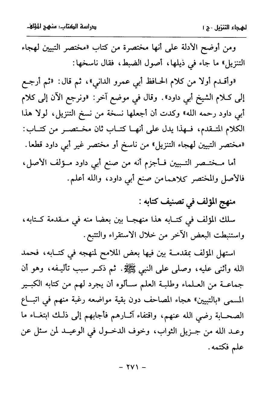 «وأقدم أولا من كلام الحافظ أبي عمرو الداني»، ثم قال: «ثم أرجع إلى كلام الشيخ أبي داود». وقال في موضع آخر: «ونرجع الآن إلى كلام أبي داود رحمه الله» وكدت أن أجعلها نسخة من نسخ التنزيل، لولا هذا الكلام المتقدم، فهذا يدل على أنها كتاب ثان مختصر من كتاب: