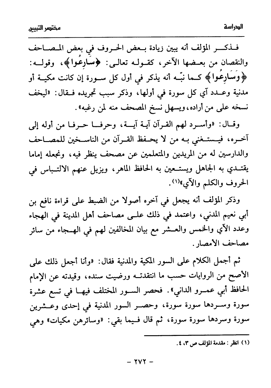 وسارعوا كما نبّه أنه يذكر في أول كل سورة إن كانت مكية أو مدنية وعدد آي كل سورة في أولها، وذكر سبب تجريده فقال: «ليخف نسخه على من أراده، ويسهل نسخ المصحف منه لمن رغبه».