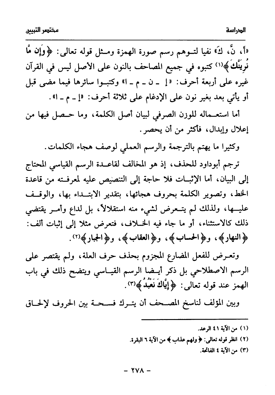 وتعرض للفعل المضارع المجزوم بحذف حرف العلة، ولم يقتصر على الرسم الاصطلاحي بل ذكر أيضا الرسم القياسي ويتضح ذلك في باب الهمز عند قوله تعالى: إيّاك نعبد (¬3).