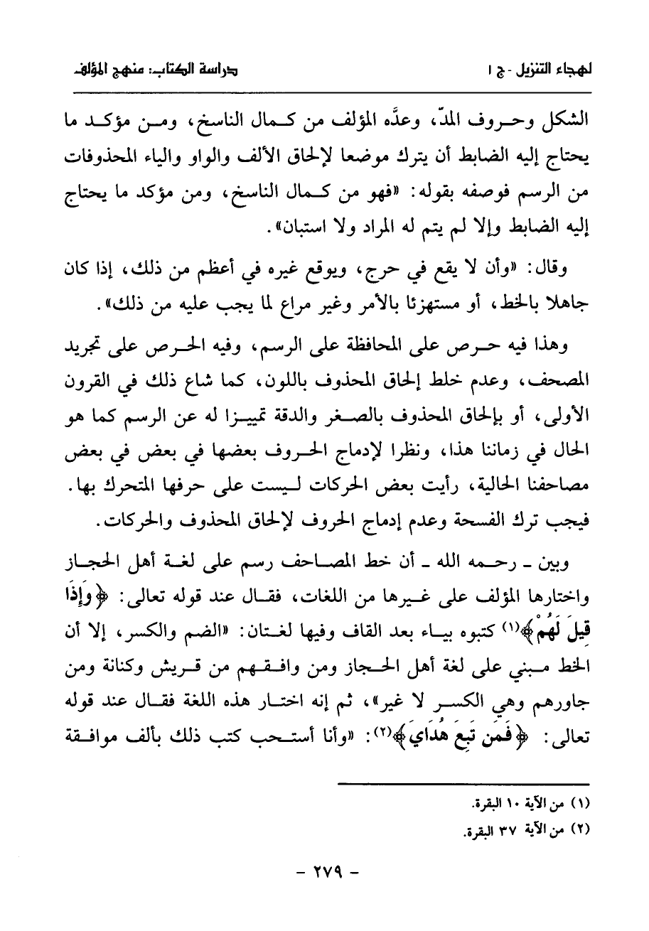 وبين- رحمه الله- أن خط المصاحف رسم على لغة أهل الحجاز واختارها المؤلف على غيرها من اللغات، فقال عند قوله تعالى: وإذا قيل لهم (¬1) كتبوه بياء بعد القاف وفيها لغتان: «الضم والكسر، إلا أن الخط مبني على لغة أهل الحجاز ومن وافقهم من قريش وكنانة ومن جاورهم وهي الكسر لا غير»، ثم إنه اختار هذه اللغة فقال عند قوله تعالى: فمن تبع هداي (¬2): «وأنا أستحب كتب ذلك بألف موافقة