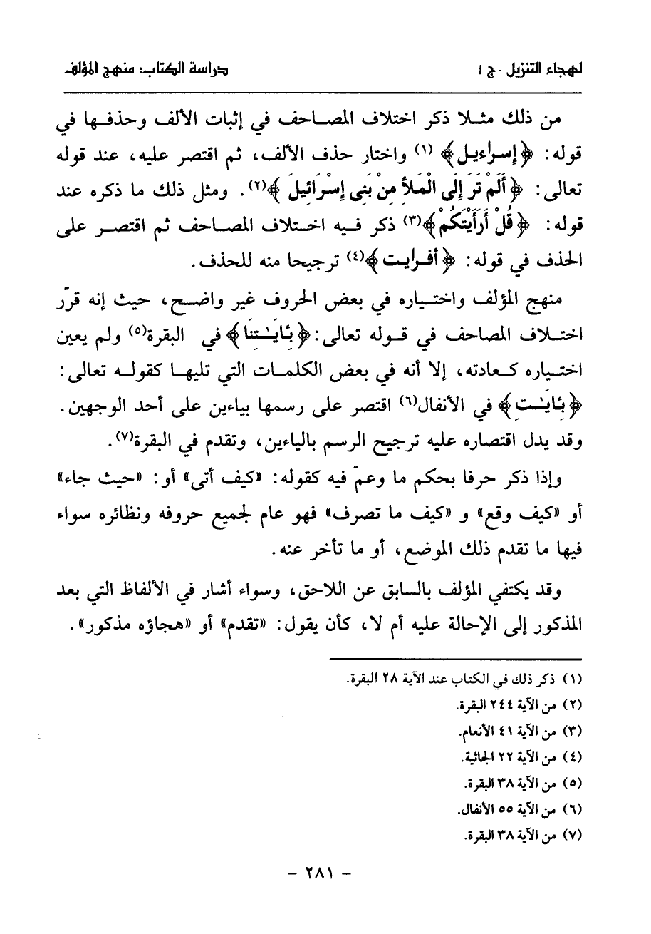 من ذلك مثلا ذكر اختلاف المصاحف في إثبات الألف وحذفها في قوله: إسرائيل (¬1) واختار حذف الألف، ثم اقتصر عليه، عند قوله تعالى: ألم تر إلى الملأ من بني إسرائيل (¬2). ومثل ذلك ما ذكره عند قوله: قل أرأيتكم (¬3) ذكر فيه اختلاف المصاحف ثم اقتصر على الحذف في قوله: أفرايت (¬4) ترجيحا منه للحذف.