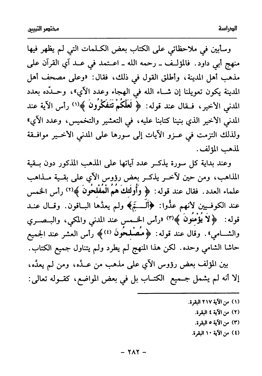 وعند بداية كل سورة يذكر عدد آياتها على المذهب المذكور دون بقية المذاهب، ومن حين لآخر يذكر بعض رءوس الآي على بقية مذاهب علماء العدد. فقال عند قوله: وأولئك هم المفلحون (¬2) رأس الخمس عند الكوفيين لأنهم عدّوا: ألمّ ولم يعدّها الباقون. وقال عند قوله: لا يؤمنون (¬3) «رأس الخمس عند المدني والمكي، والبصري والشامي». وقال عند قوله: مصلحون (¬4) رأس العشر عند الجميع حاشا الشامي وحده. لكن هذا المنهج لم يطرد ولم يتناول جميع الكتاب.