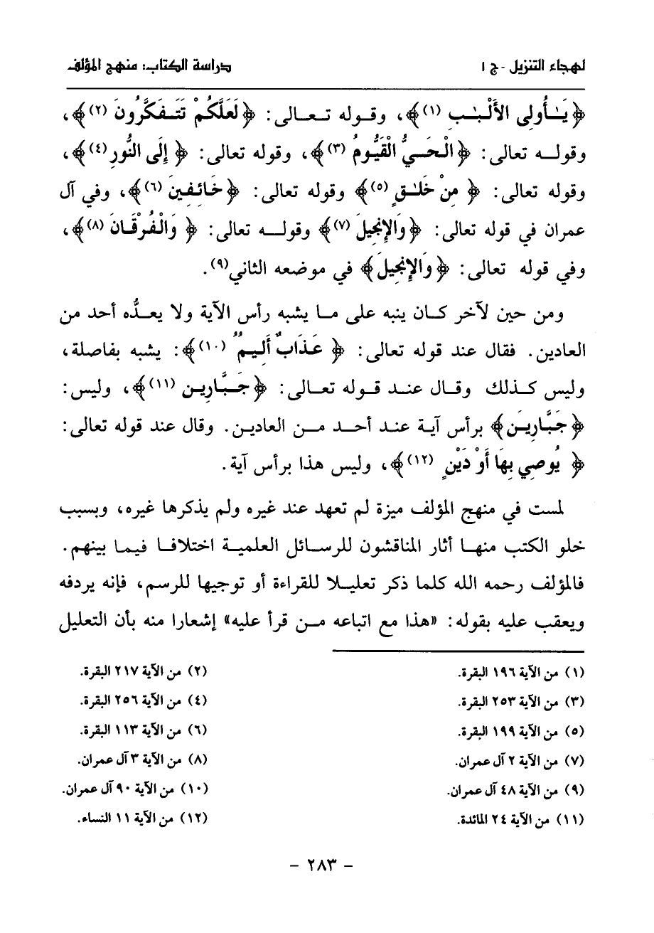 ومن حين لآخر كان ينبه على ما يشبه رأس الآية ولا يعدّه أحد من العادين. فقال عند قوله تعالى: عذاب أليم (¬10): يشبه بفاصلة، وليس كذلك وقال عند قوله تعالى: جبّارين (¬11)، وليس: