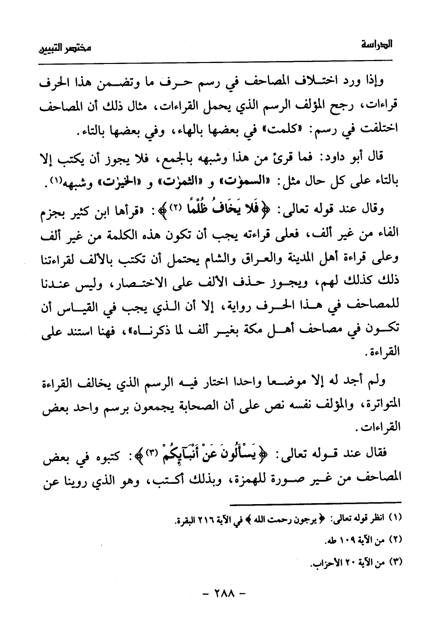 وقال عند قوله تعالى: فلا يخاف ظلما (¬2): «قرأها ابن كثير بجزم الفاء من غير ألف، فعلى قراءته يجب أن تكون هذه الكلمة من غير ألف وعلى قراءة أهل المدينة والعراق والشام يحتمل أن تكتب بالألف لقراءتنا ذلك كذلك لهم، ويجوز حذف الألف على الاختصار، وليس عندنا للمصاحف في هذا الحرف رواية، إلا أن الذي يجب في القياس