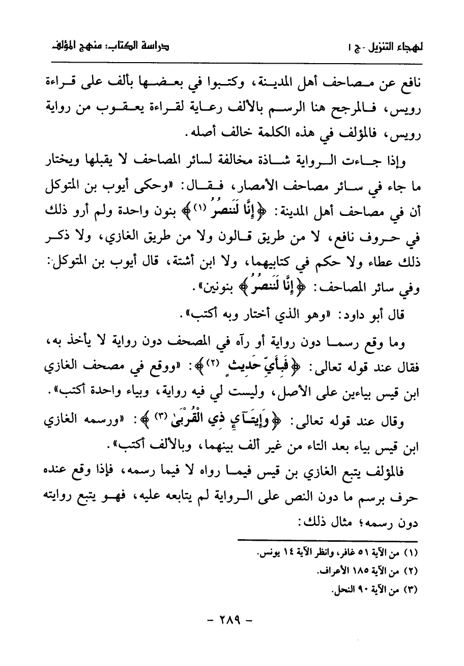وإذا جاءت الرواية شاذة مخالفة لسائر المصاحف لا يقبلها ويختار ما جاء في سائر مصاحف الأمصار، فقال: «وحكى أيوب بن المتوكل أن في مصاحف أهل المدينة: إنّا لننصر (¬1) بنون واحدة ولم أرو ذلك في حروف نافع، لا من طريق قالون ولا من طريق الغازي، ولا ذكر ذلك عطاء ولا حكم في كتابيهما، ولا ابن أشتة، قال أيوب بن المتوكل: