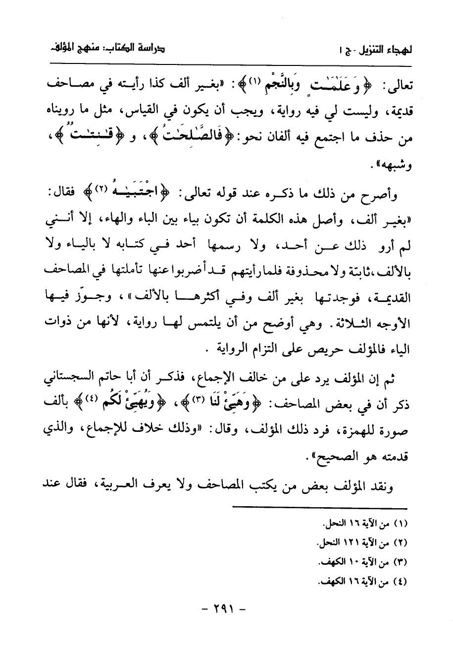 ثم إن المؤلف يرد على من خالف الإجماع، فذكر أن أبا حاتم السجستاني ذكر أن في بعض المصاحف: وهيّئ لنا (¬3)، ويهيّئ لكم (¬4) بألف صورة للهمزة، فرد ذلك المؤلف، وقال: «وذلك خلاف للإجماع، والذي قدمته هو الصحيح».