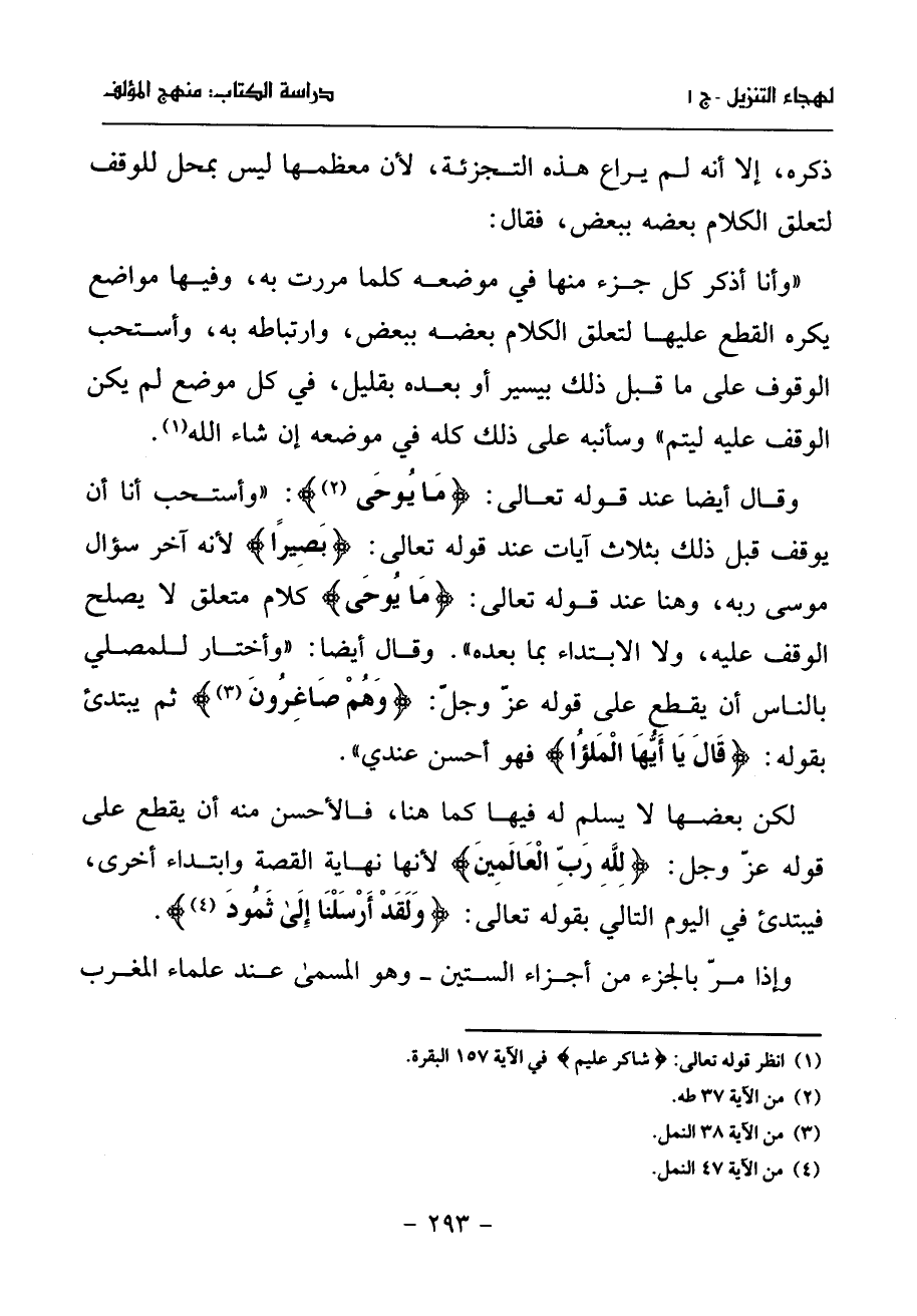 وقال أيضا عند قوله تعالى: ما يوحى (¬2): «وأستحب أنا أن يوقف قبل ذلك بثلاث آيات عند قوله تعالى: بصيرا لأنه آخر سؤال موسى ربه، وهنا عند قوله تعالى: ما يوحى كلام متعلق لا يصلح الوقف عليه، ولا الابتداء بما بعده». وقال أيضا: «وأختار للمصلي بالناس أن يقطع على قوله عزّ وجلّ: وهم صاغرون (¬3) ثم يبتدئ بقوله: قال يا أيّها الملؤا فهو أحسن عندي».