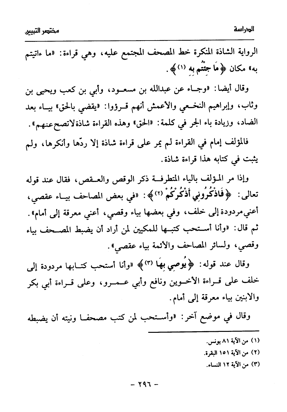 وإذا مر المؤلف بالياء المتطرفة ذكر الوقص والعقص، فقال عند قوله تعالى: فاذكروني أذكركم (¬2): «في بعض المصاحف بياء عقصي، أعني مردودة إلى خلف، وفي بعضها بياء وقصي، أعني معرفة إلى أمام».