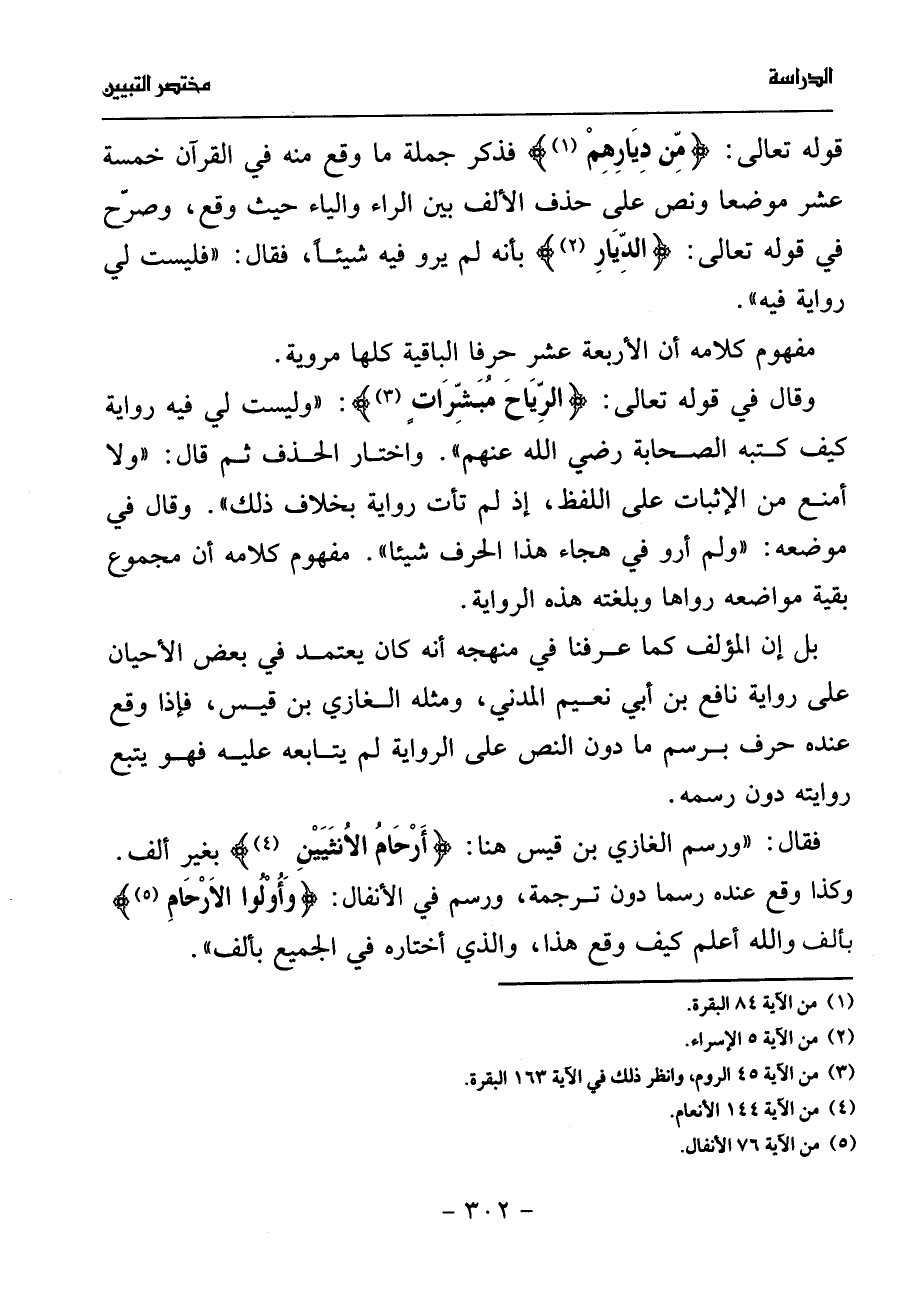 قوله تعالى: مّن ديارهم (¬1) فذكر جملة ما وقع منه في القرآن خمسة عشر موضعا ونص على حذف الألف بين الراء والياء حيث وقع، وصرّح في قوله تعالى: الدّيار (¬2) بأنه لم يرو فيه شيئا، فقال: «فليست لي رواية فيه».