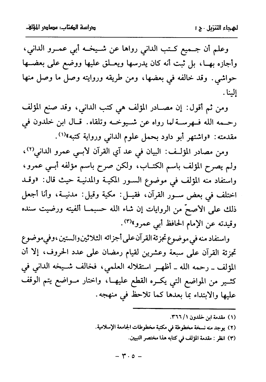 ومن ثم أقول: إن مصادر المؤلف هي كتب الداني، وقد صنع المؤلف رحمه الله فهرسة لما رواه عن شيوخه وتلقاه. قال ابن خلدون في مقدمته: «واشتهر أبو داود بحمل علوم الداني ورواية كتبه» (¬1).