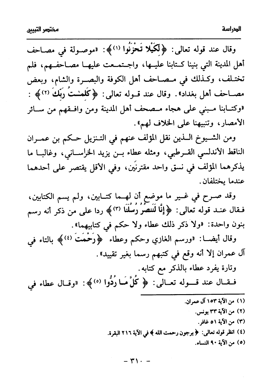 وقد صرح في غير ما موضع أن لهما كتابين، ولم يسم الكتابين، فقال عند قوله تعالى: إنّا لننصر رسلنا (¬3) ردا على من ذكر أنه رسم بنون واحدة: «ولا ذكر ذلك عطاء ولا حكم في كتابيهما».