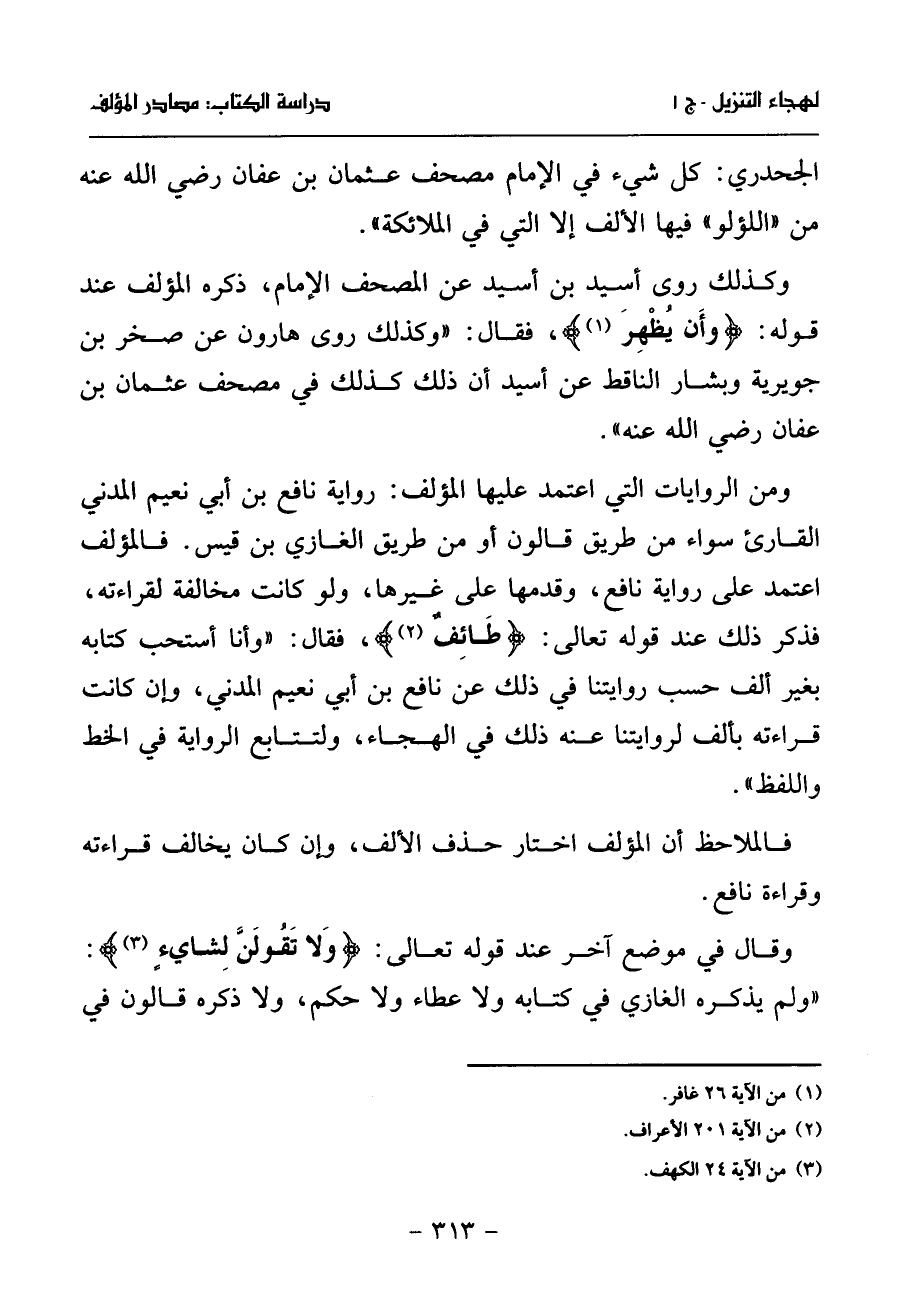 الجحدري: كل شيء في الإمام مصحف عثمان بن عفان رضي الله عنه من «اللؤلؤ» فيها الألف إلا التي في الملائكة».