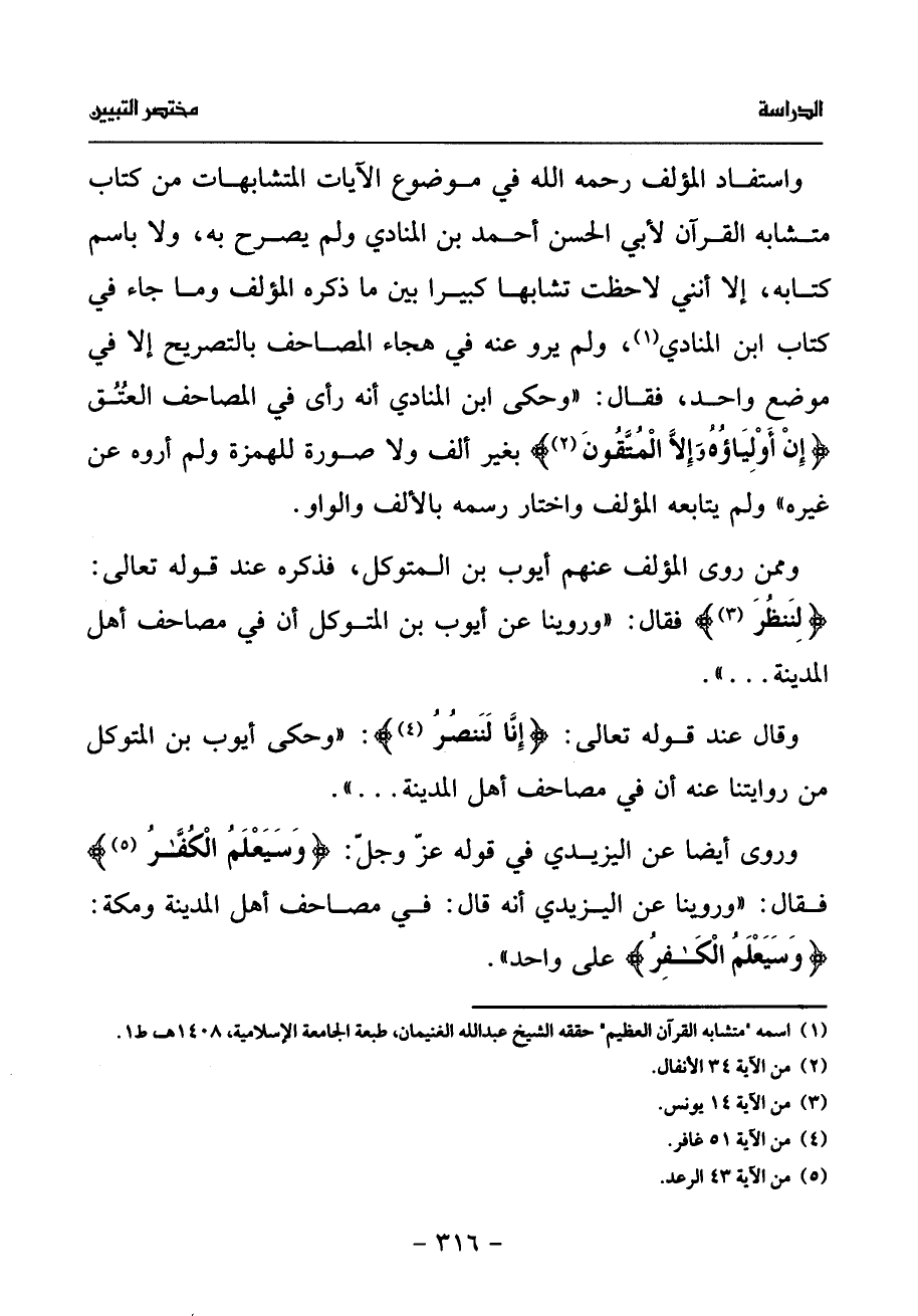 واستفاد المؤلف رحمه الله في موضوع الآيات المتشابهات من كتاب متشابه القرآن لأبي الحسن أحمد بن المنادي ولم يصرح به، ولا باسم كتابه، إلا أنني لاحظت تشابها كبيرا بين ما ذكره المؤلف وما جاء في كتاب ابن المنادي (¬1)، ولم يرو عنه في هجاء المصاحف بالتصريح إلا في موضع واحد، فقال: «وحكى ابن المنادي أنه رأى في المصاحف العتق إن أولياؤه إلّا المتّقون (¬2) بغير ألف ولا صورة للهمزة ولم أروه عن غيره» ولم يتابعه المؤلف واختار رسمه بالألف والواو.