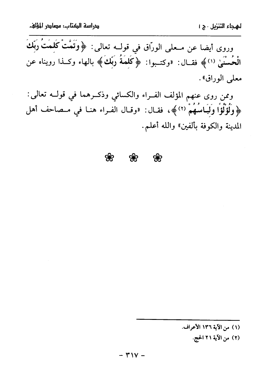 وروى أيضا عن معلى الورّاق في قوله تعالى: وتمّت كلمت ربّك الحسنى (¬1) فقال: «وكتبوا: كلمة ربّك بالهاء وكذا رويناه عن معلى الوراق».