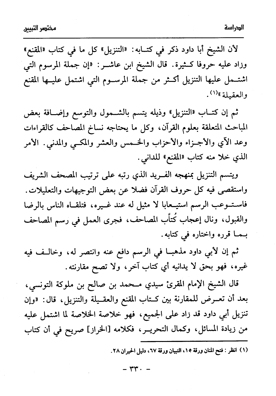 لأن الشيخ أبا داود ذكر في كتابه: «التنزيل» كل ما في كتاب «المقنع» وزاد عليه حروفا كثيرة. قال الشيخ ابن عاشر: «إن جملة المرسوم التي اشتمل عليها التنزيل أكثر من جملة المرسوم التي اشتمل عليها المقنع والعقيلة» (¬1).