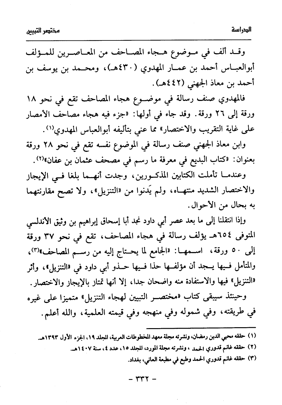 وإذا انتقلنا إلى ما بعد عصر أبي داود نجد أبا إسحاق إبراهيم بن وثيق الأندلسي المتوفى 654 هـ يؤلف رسالة في هجاء المصاحف، تقع في نحو 37 ورقة إلى 50 ورقة، اسمها: «الجامع لما يحتاج إليه من رسم المصاحف» (¬3)، والمتأمل فيها يجد أن مؤلفها حذا فيها حذو أبي داود في «التنزيل»، وأثر «التنزيل» فيها والاستفادة منه واضحان جدا، إلا أنها تمتاز بالإيجاز والاختصار.