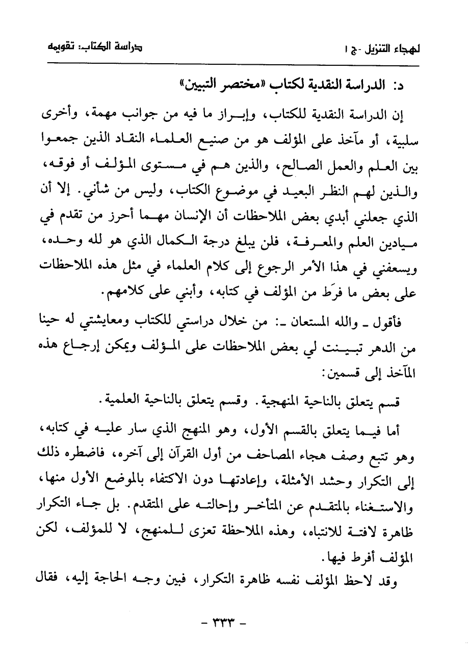 إن الدراسة النقدية للكتاب، وإبراز ما فيه من جوانب مهمة، وأخرى سلبية، أو مآخذ على المؤلف هو من صنيع العلماء النقاد الذين جمعوا بين العلم والعمل الصالح، والذين هم في مستوى المؤلف أو فوقه، والذين لهم النظر البعيد في موضوع الكتاب، وليس من شأني. إلا أن الذي جعلني أبدي بعض الملاحظات أن الإنسان مهما أحرز من تقدم في ميادين العلم والمعرفة، فلن يبلغ درجة الكمال الذي هو لله وحده، ويسعفني في هذا الأمر الرجوع إلى كلام العلماء في مثل هذه الملاحظات على بعض ما فرط من المؤلف في كتابه، وأبني على كلامهم.