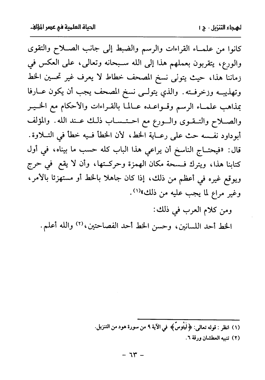 كانوا من علماء القراءات والرسم والضبط إلى جانب الصلاح والتقوى والورع، يتقربون بعملهم هذا إلى الله سبحانه وتعالى، على العكس في زماننا هذا، حيث يتولى نسخ المصحف خطاط لا يعرف غير تحسين الخط وتهذيبه وزخرفته. والذي يتولى نسخ المصحف يجب أن يكون عارفا بمذاهب علماء الرسم وقواعده عالما بالقراءات والأحكام مع الخير والصلاح والتقوى والورع مع احتساب ذلك عند الله. والمؤلف أبو داود نفسه حث على رعاية الخط، لأن الخطأ فيه خطأ في التلاوة.