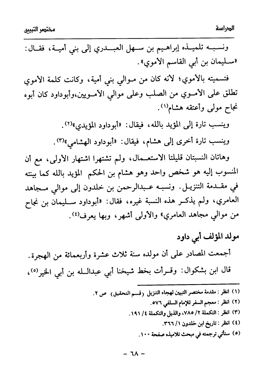 وهاتان النسبتان قليلتا الاستعمال، ولم تشتهرا اشتهار الأولى، مع أن المنسوب إليه هو شخص واحد وهو هشام بن الحكم المؤيد بالله كما بينته في مقدمة التنزيل. ونسبه عبد الرحمن بن خلدون إلى موالي مجاهد العامري، ولم يذكر هذه النسبة غيره، فقال: «أبو داود سليمان بن نجاح من موالي مجاهد العامري» والأولى أشهر، وبها يعرف (¬4).