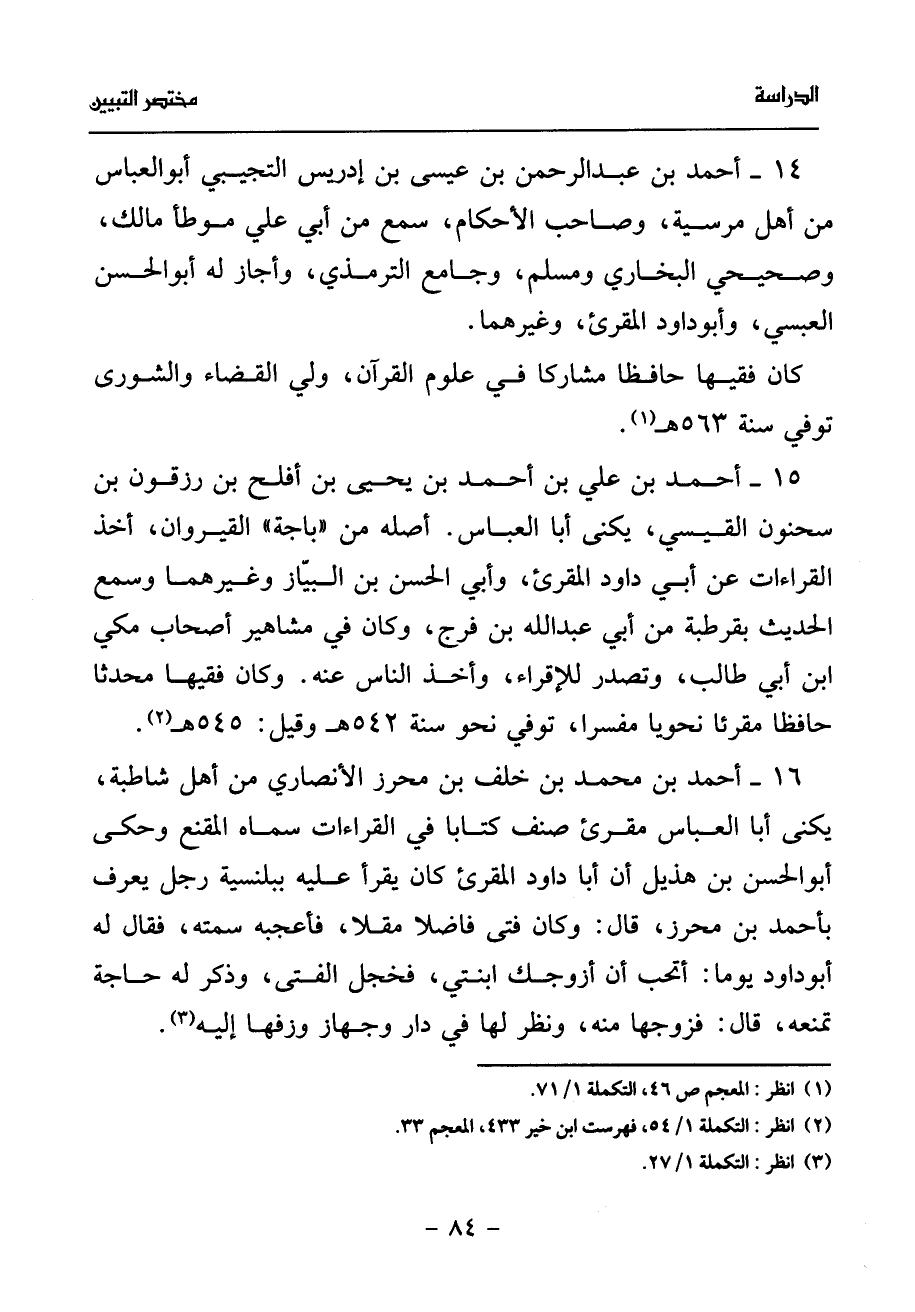 14 - أحمد بن عبد الرحمن بن عيسى بن إدريس التجيبي أبو العباس من أهل مرسية، وصاحب الأحكام، سمع من أبي علي موطأ مالك، وصحيحي البخاري ومسلم، وجامع الترمذي، وأجاز له أبو الحسن العبسي، وأبو داود المقرئ، وغيرهما.