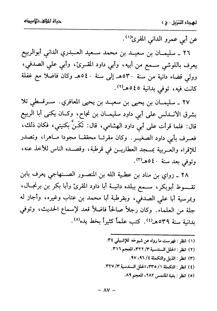 27 - سليمان بن يحيى بن سعيد بن يحيى المعافري. سرقسطي تلا بشرق الأندلس على أبي داود سليمان بن نجاح، وكان يكنى أبا الربيع قال: فلما قرأت على أبي داود الهشامي، قال: تكنّ بكنيتي، فكان ذلك، فعرف بأبي داود الصغير. وكان مقرئا محققا مجودا ماهرا، وتصدر للإقراء والعربية بمسجد العطارين في قرطبة، وقصده الناس للأخذ عنه، وتوفي بعد سنة 540 هـ (¬3).