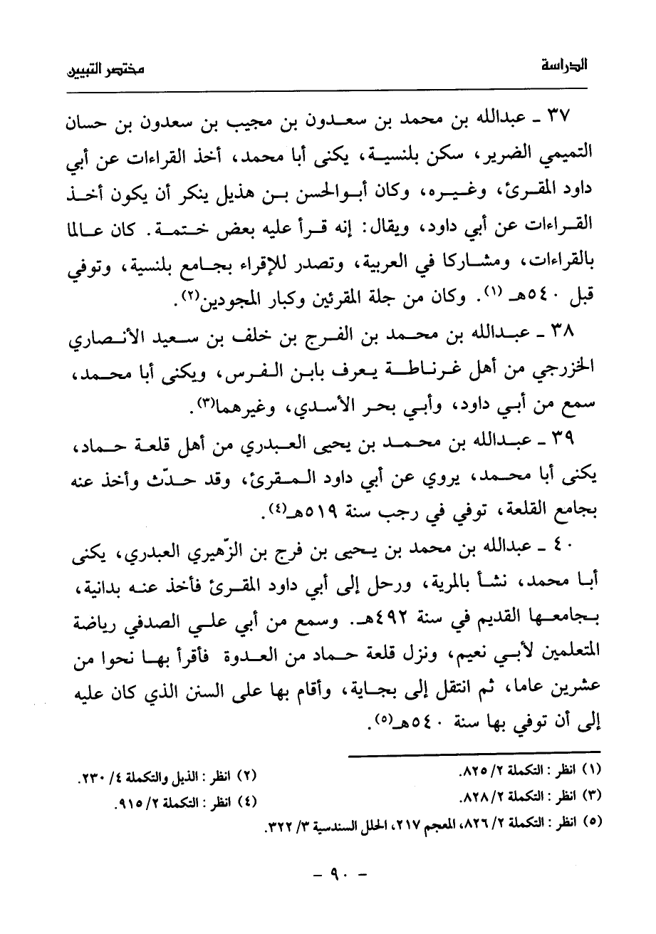 39 - عبد الله بن محمد بن يحيى العبدري من أهل قلعة حماد، يكنى أبا محمد، يروي عن أبي داود المقرئ، وقد حدّث وأخذ عنه بجامع القلعة، توفي في رجب سنة 519 هـ (¬4).