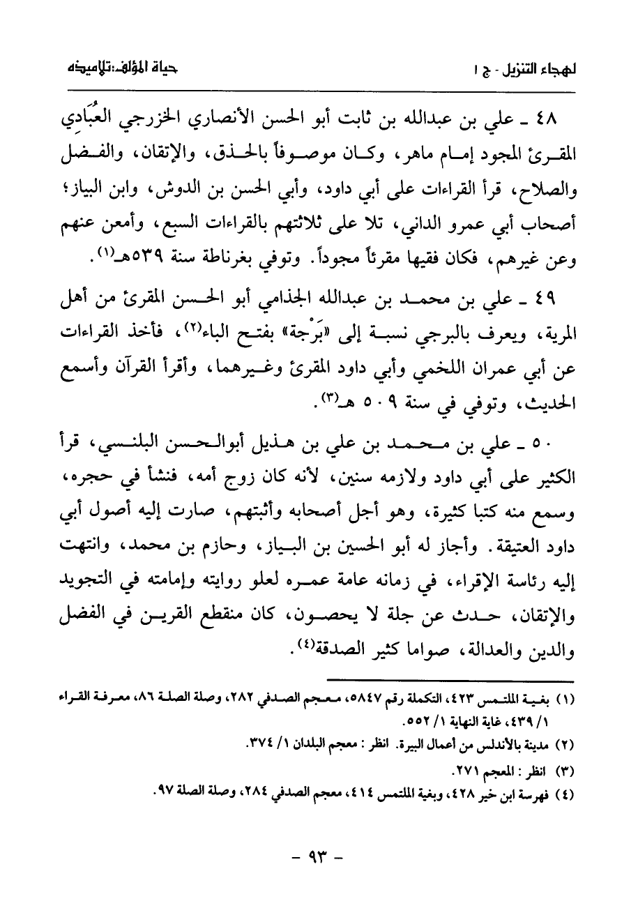 49 - علي بن محمد بن عبد الله الجذامي أبو الحسن المقرئ من أهل المرية، ويعرف بالبرجي نسبة إلى «برجة» بفتح الباء (¬2)، فأخذ القراءات عن أبي عمران اللخمي وأبي داود المقرئ وغيرهما، وأقرأ القرآن وأسمع الحديث، وتوفي في سنة 509 هـ (¬3).
