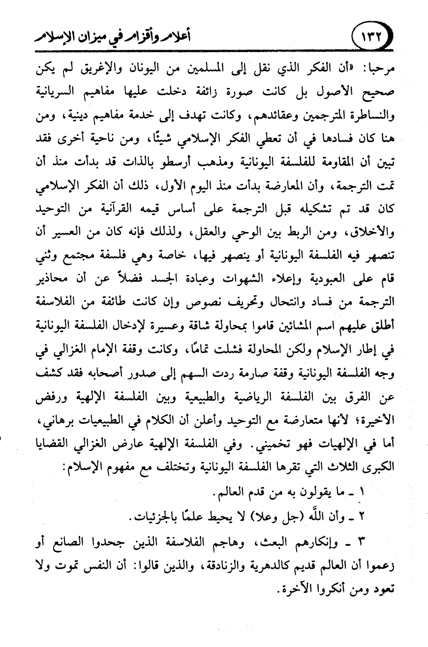 مرحبا: "أن الفكر الذي نقل إلى المسلمين من اليونان والإغريق لم يكن صحيح الأصول بل كانت صورة زائفة دخلت عليها مفاهيم السريانية والنساطرة المترجمين وعقائدهم، وكانت تهدف إلى خدمة مفاهيم دينية، ومن هنا كان فسادها في أن تعطي الفكر الإسلامي شيئًا، ومن ناحية أخرى فقد تبين أن المقاومة للفلسفة اليونانية ومذهب أرسطو بالذات قد بدأت منذ أن تمت الترجمة، وأن المعارضة بدأت منذ اليوم الأول، ذلك أن الفكر الإسلامي كان قد تم تشكيله قبل الترجمة على أساس قيمه القرآنية من التوحيد والأخلاق، ومن الربط بين الوحي والعقل، ولذلك فإنه كان من العسير أن تنصهر فيه الفلسفة اليونانية أو ينصهر فيها، خاصة وهي فلسفة مجتمع وثني قام على العبودية وإعلاء الشهوات وعبادة الجسد فضلاً عن أن محاذير الترجمة من فساد وانتحال وتحريف نصوص وإن كانت طائفة من الفلاسفة أطلق عليهم اسم المشائين قاموا بمحاولة شاقة وعسيرة لإدخال الفلسفة اليونانية في إطار الإسلام ولكن المحاولة فشلت تمامًا، وكانت وقفة الإمام الغزالي في وجه الفلسفة اليونانية وقفة صارمة ردت السهم إلى صدور أصحابه فقد كشف عن الفرق بين الفلسفة الرياضية والطبيعية وبين الفلسفة الإلهية ورفض الأخيرة؛ لأنها متعارضة مع التوحيد وأعلن أن الكلام في الطبيعيات برهاني، أما في الإلهيات فهو تخميني. وفي الفلسفة الإلهية عارض الغزالي القضايا الكبرى الثلاث التي تقرها الفلسفة اليونانية وتختلف مع مفهوم الإسلام: