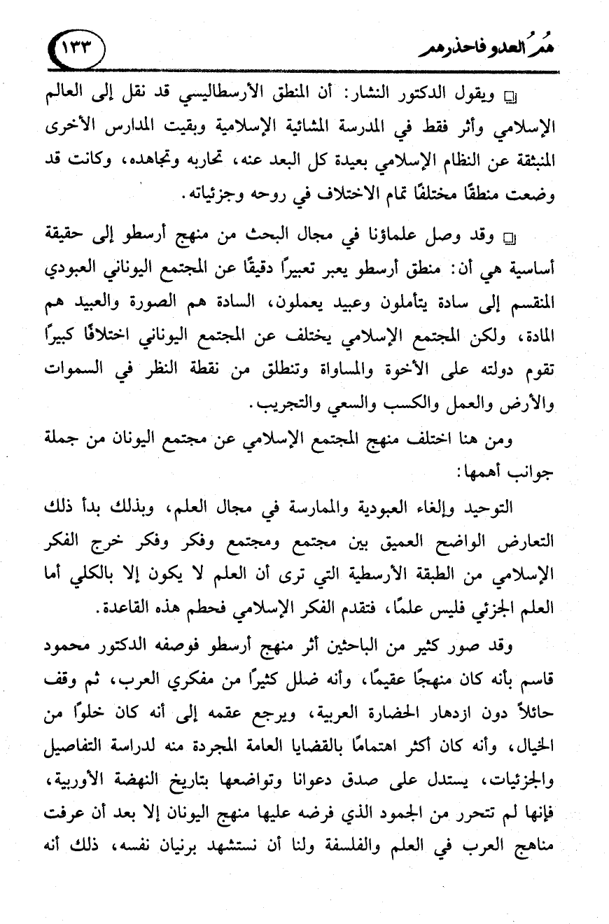وقد وصل علماؤنا في مجال البحث من منهج أرسطو إلى حقيقة أساسية هي أن: منطق أرسطو يعبر تعبيرًا دقيقًا عن المجتمع اليوناني العبودي المنقسم إلى سادة يتأملون وعبيد يعملون، السادة هم الصورة والعبيد هم المادة، ولكن المجتمع الإسلامي يختلف عن المجتمع اليوناني اختلافًا كبيرًا تقوم دولته على الأخوة والمساواة وتنطلق من نقطة النظر في السموات والأرض والعمل والكسب والسعي والتجريب.