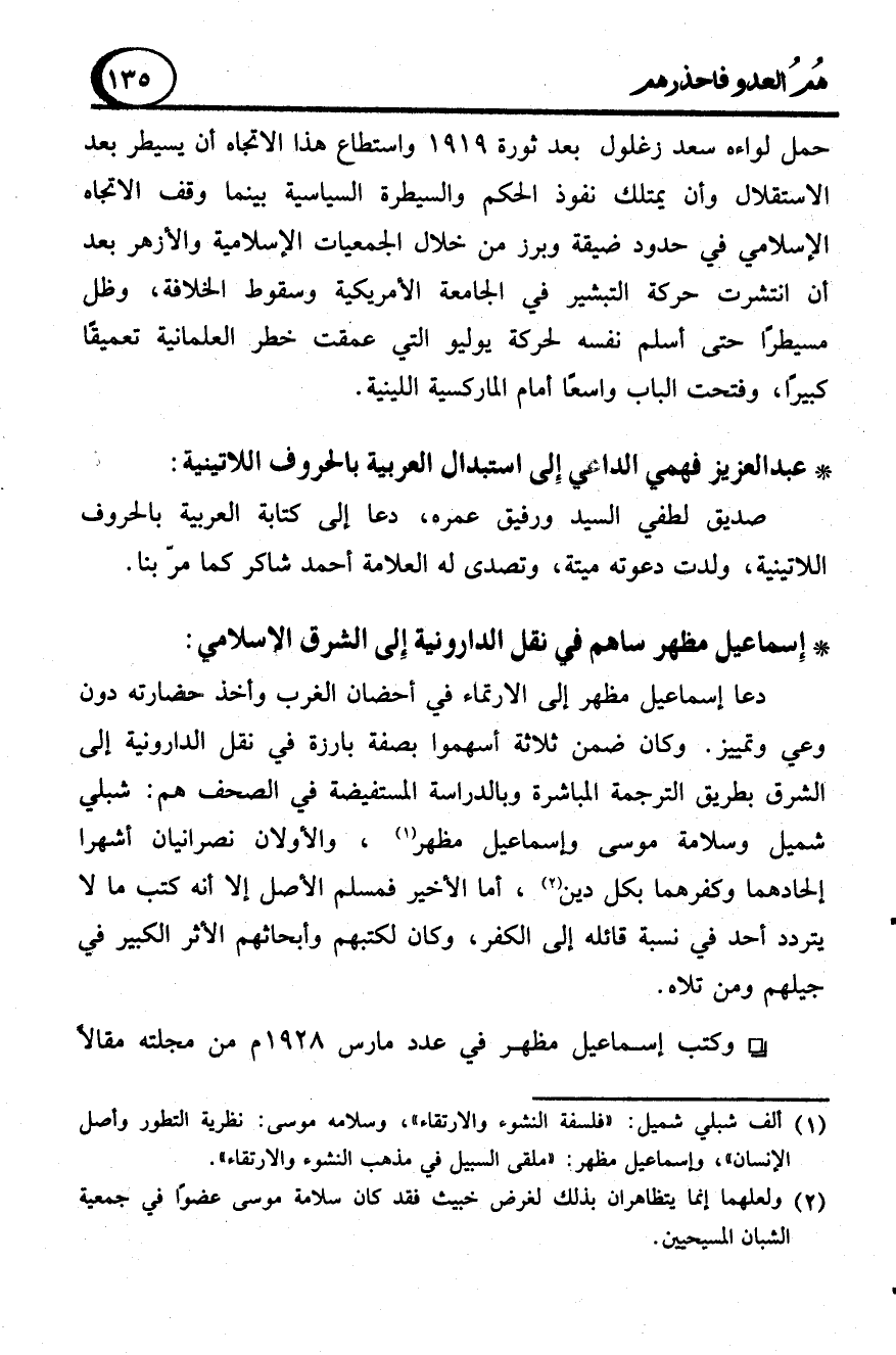 (2) ولعلهما إنما يتظاهران بذلك لغرض خبيث فقد كان سلامة موسى عضوًا في جمعية الشبان المسيحين.