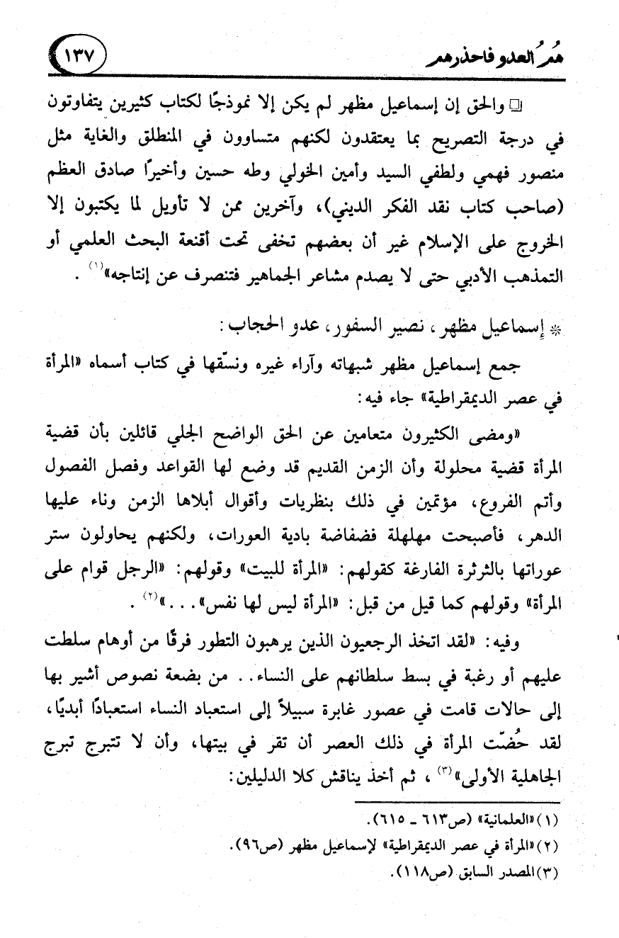 والحق إن إسماعيل مظهر لم يكن إلا نموذجًا لكتاب كثيرين يتفاوتون في درجة التصريح بما يعتقدون لكنهم متساوون في المنطلق والغاية مثل منصور فهمي ولطفي السيد وأمين الخولي وطه حسين وأخيرًا صادق العظم (صاحب كتاب نقد الفكر الديني)، وآخرين ممن لا تأويل لما يكتبون إلا الخروج على الإسلام غير أن بعضهم تخفى تحت أقنعة البحث العلمي أو التمذهب الأدبي حتى لا يصدم مشاعر الجماهير فتنصرف عن إنتاجه" (1).