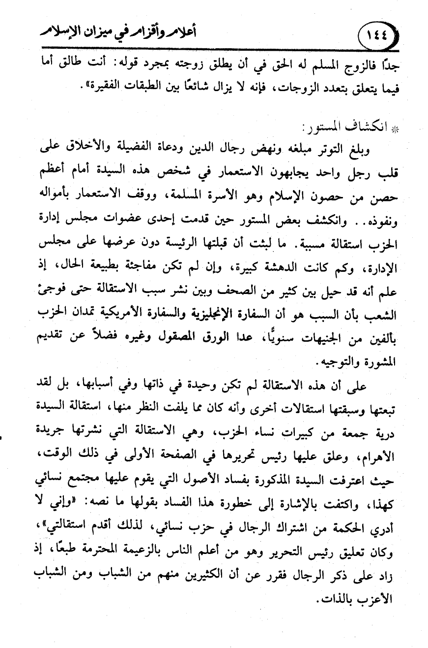 وبلغ التوتر مبلغه ونهض رجال الدين ودعاة الفضيلة والأخلاق على قلب رجل واحد يجابهون الاستعمار في شخص هذه السيدة أمام أعظم حصن من حصون الإسلام وهو الأسرة المسلمة، ووقف الاستعمار بأمواله ونفوذه .. وانكشف بعض المستور حين قدمت إحدى عضوات مجلس إدارة الحزب استقالة مسببة. ما لبثت أن قبلتها الرئيسة دون عرضها على مجلس الإدارة، وكم كانت الدهشة كبيرة، وإن لم تكن مفاجئة بطبيعة الحال، إذ