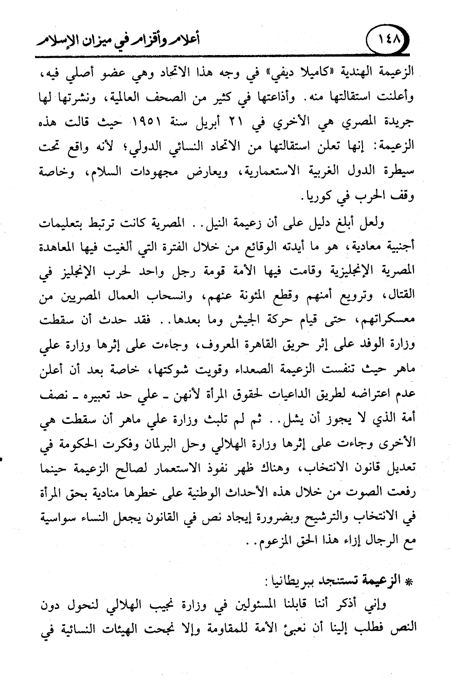 وإني أذكر أننا قابلنا المسئولين في وزارة نجيب الهلالي لنحول دون النص فطلب إلينا أن نعبئ الأمة للمقاومة وإلا نجحت الهيئات النسائية في