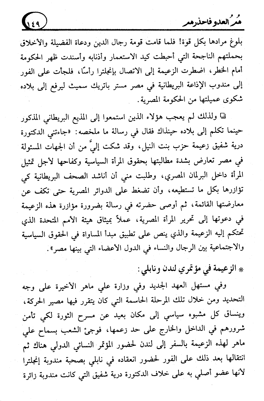 بلوغ مرادها بكل قوة! فلما قامت قومة رجال الدين ودعاة الفضيلة والأخلاق بحملتهم الناجحة التي أحبطت كيد الاستعمار وأذنابه وأسندت ظهر الحكومة أمام الخطر، اضطرت الزعيمة إلى الاتصال بإنجلترا رأسًا، فلجأت على الفور إلى مندوب الإذاعة البريطانية في مصر مستر باتريك سميث ليرفع إلى بلاده شكوى عميلتها من الحكومة المصرية.