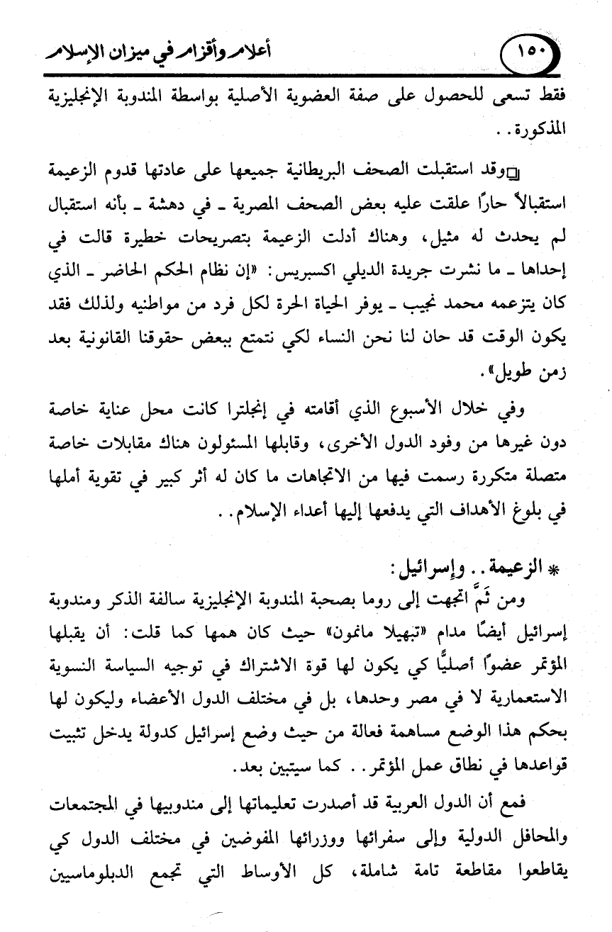 وفي خلال الأسبوع الذي أقامته في إنجلترا كانت محل عناية خاصة دون غيرها من وفود الدول الأخرى، وقابلها المسئولون هناك مقابلات خاصة متصلة متكررة رسمت فيها من الاتجاهات ما كان له أثر كبير في تقوية أملها في بلوغ الأهداف التي يدفعها إليها أعداء الإسلام ..
