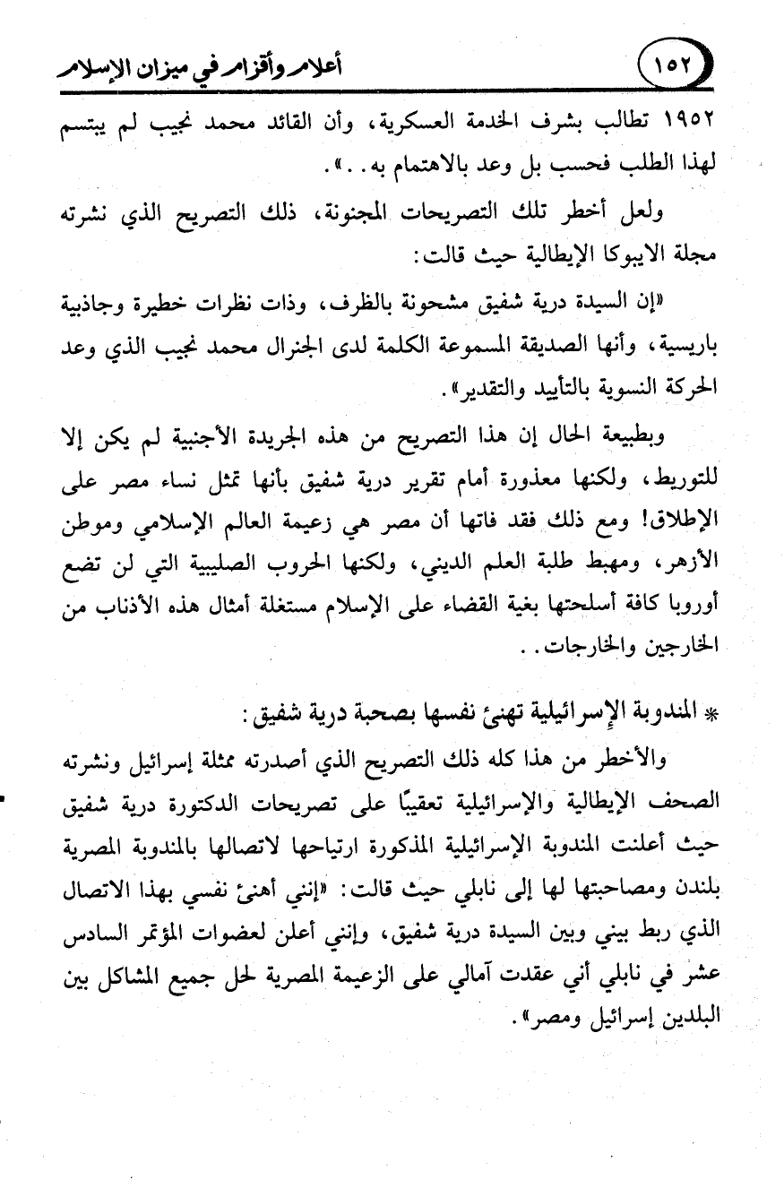 وبطبيعة الحال إن هذا التصريح من هذه الجريدة الأجنبية لم يكن إلا للتوريط، ولكنها معذورة أمام تقرير درية شفيق بأنها تمثل نساء مصر على الإطلاق! ومع ذلك لقد فاتها أن مصر هي زعيمة العالم الإسلامي وموطن الأزهر، ومهبط طلبة العلم الديني، ولكنها الحروب الصليبية التي لن تضع أوروبا كافة أسلحتها بغية القضاء على الإسلام مستغلة أمثال هذه الأذناب من الخارجين والخارجات ..