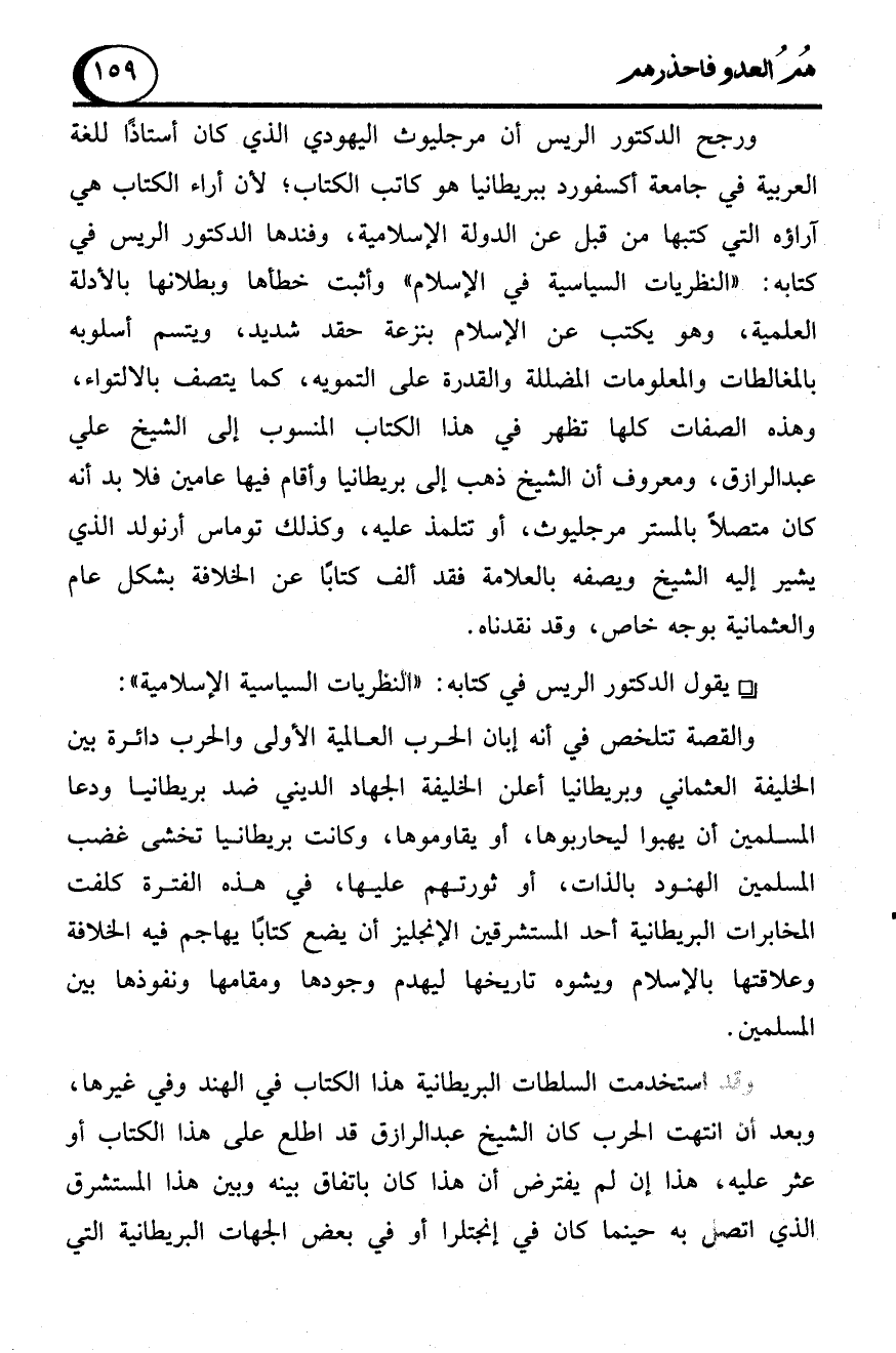 ورجح الدكتور الريس أن مرجليوث اليهودي الذي كان أستاذًا للغة العربية في جامعة أكسفورد ببريطانيا هو كاتب الكتاب؛ لأن أراء الكتاب هي آراؤه التي كتبها من قبل عن الدولة الإسلامية، وفندها الدكتور الريس في كتابه. "النظريات السياسية في الإسلام" وأثبت خطأها وبطلانها بالأدلة العلمية، وهو يكتب عن الإسلام بنزعة حقد شديد، ويتسم أسلوبه بالمغالطات والمعلومات المضللة والقدرة على التمويه، كما يتصف بالالتواء، وهذه الصفات كلها تظهر في هذا الكتاب المنسوب إلى الشيخ علي عبد الرازق، ومعروف أن الشيخ ذهب إلى بريطانيا وأقام فيها عامين فلا بد أنه كان متصلاً بالمستر مرجليوث، أو تتلمذ عليه، وكذلك توماس أرنولد الذي يشير إليه الشيخ ويصفه بالعلامة فقد ألف كتابًا عن الخلافة بشكل عام والعثمانية بوجه خاص، وقد نقدناه.