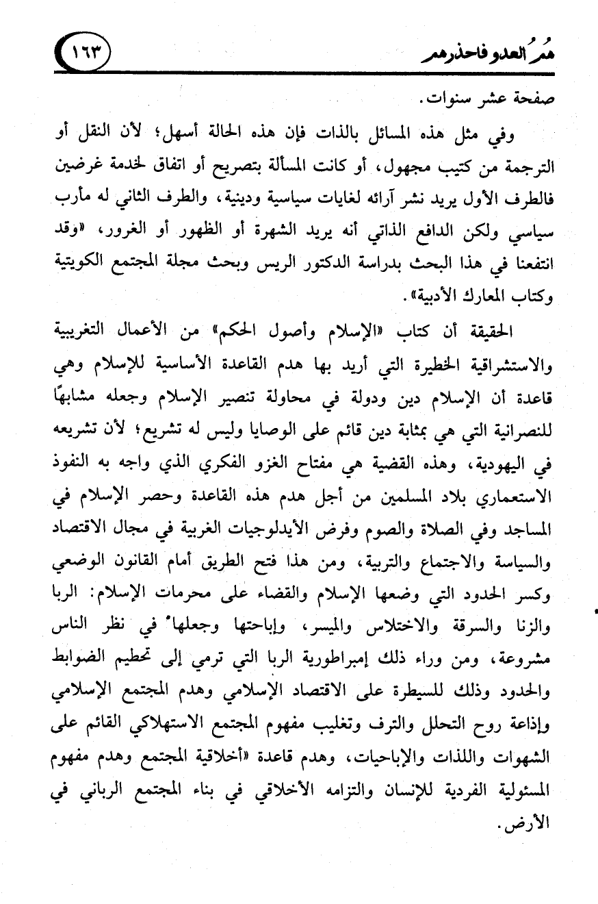 الحقيقة أن كتاب "الإسلام وأصول الحكم" من الأعمال التغريبية والاستشراقية الخطيرة التي أريد بها هدم القاعدة الأساسية للإسلام وهي قاعدة أن الإسلام دين ودولة في محاولة تنصير الإسلام وجعله مشابهًا للنصرانية التي هي بمثابة دين قائم على الوصايا وليس له تشريع؛ لأن تشريعه في اليهودية، وهذه القضية هي مفتاح الغزو الفكري الذي واجه به النفوذ الاستعماري بلاد المسلمين من أجل هدم هذه القاعدة وحصر الإسلام في المساجد وفي الصلاة والصوم وفرض الأيدلوجيات الغربية في مجال الاقتصاد والسياسة والاجتماع والتربية، ومن هذا فتح الطريق أمام القانون الوضعي وكسر الحدود التي وضعها الإسلام والقضاء على محرمات الإسلام: الربا والزنا والسرقة والاختلاس والميسر، وإباحتها وجعلها في نظر الناس مشروعة، ومن وراء ذلك إمبراطورية الربا التي ترمي إلى تحطيم الضوابط والحدود وذلك للسيطرة على الاقتصاد الإسلامي وهدم المجتمع الإسلامي وإذاعة روح التحلل والترف وتغليب مفهوم المجتمع الاستهلاكي القائم على الشهوات واللذات والإباحيات، وهدم قاعدة "أخلاقية المجتمع وهدم مفهوم المسئولية الفردية للإنسان والتزامه الأخلاقي في بناء المجتمع الرباني في الأرض.