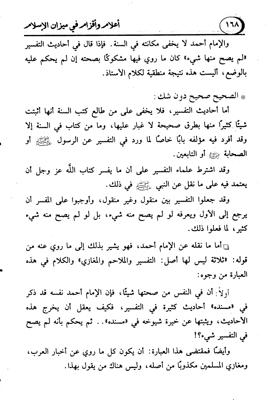 أما ما نقله عن الإمام أحمد، فهو يشير بذلك إلى ما روي عنه من قوله: "ثلاثة ليس لها أصل: التفسير والملاحم والمغازي" والكلام في هذه العبارة من وجوه: