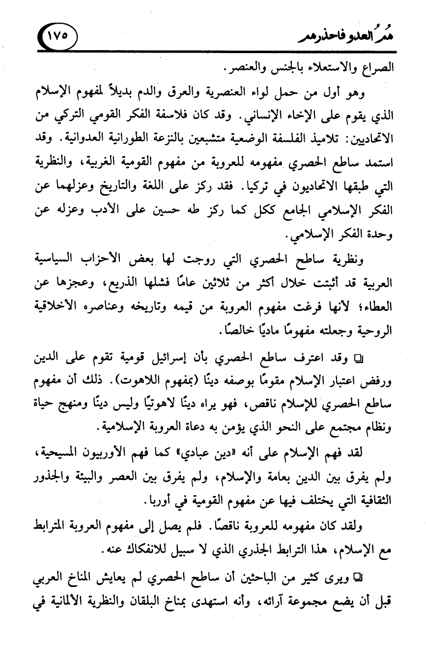 ونظرية ساطح الحصري التي روجت لها بعض الأحزاب السياسية العربية قد أثبتت خلال أكثر من ثلاثين عامًا فشلها الذريع، وعجزها عن العطاء؛ لأنها فرغت مفهوم العروبة من قيمه وتاريخه وعناصره الأخلاقية الروحية وجعلته مفهومًا ماديًا خالصًا.